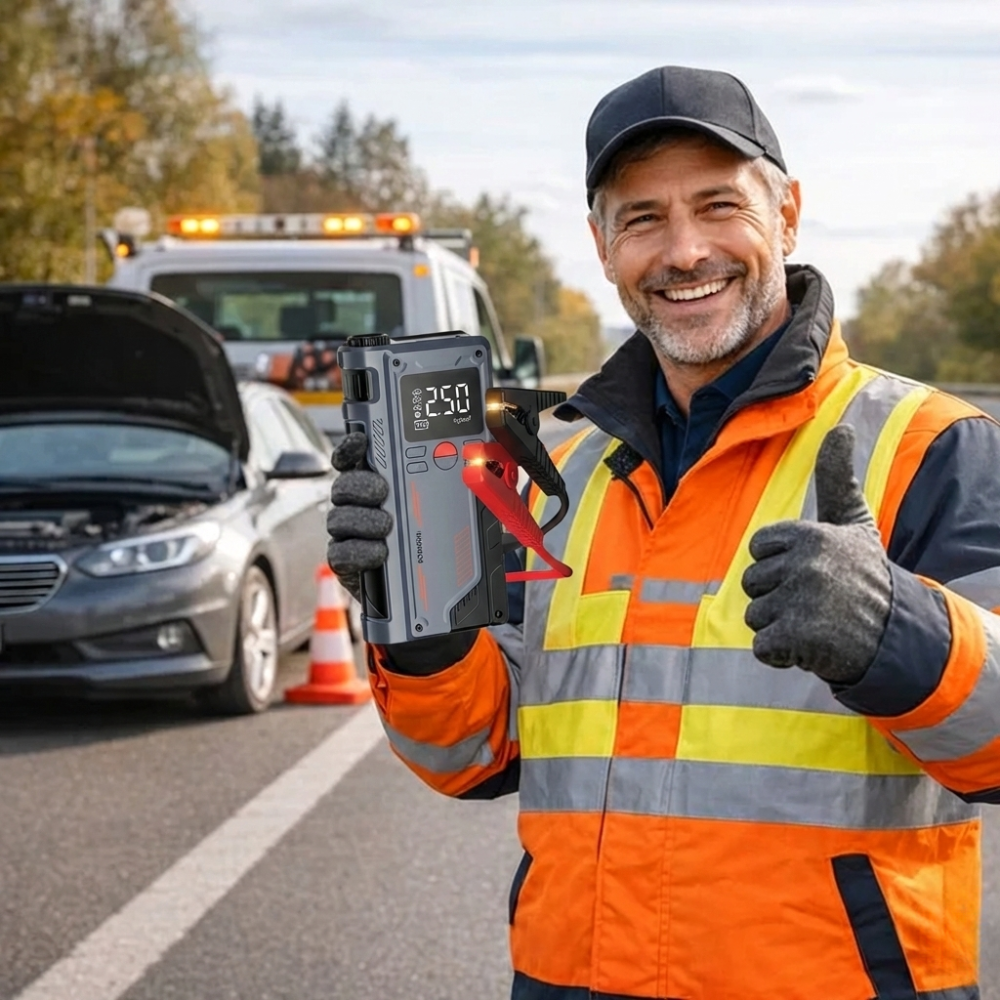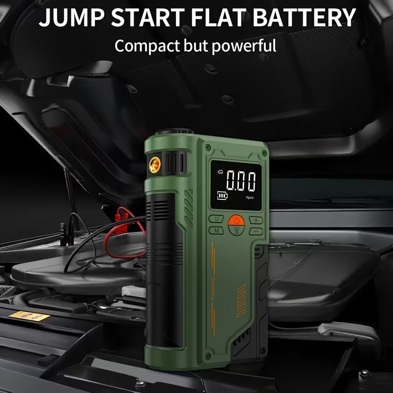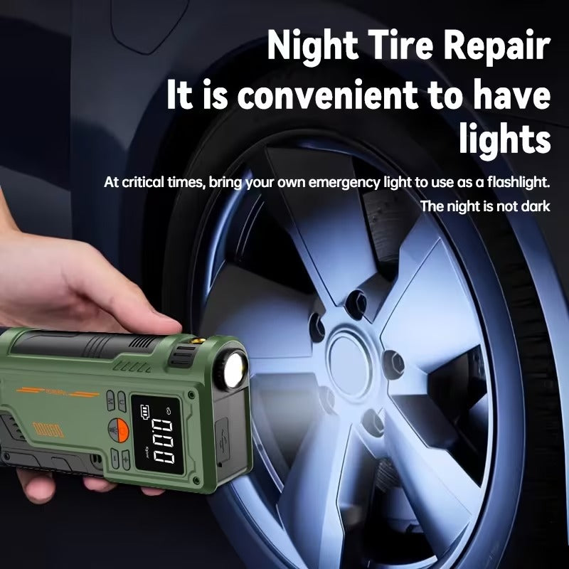 Never get stranded again with the 4-in-1 Car Jump Starter with Air Compressor & Power Bank – your ultimate roadside emergency companion.