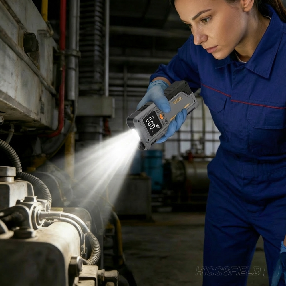 4-in-1 Functionality: Car jump starter, tire inflator, power bank, and LED flashlight.