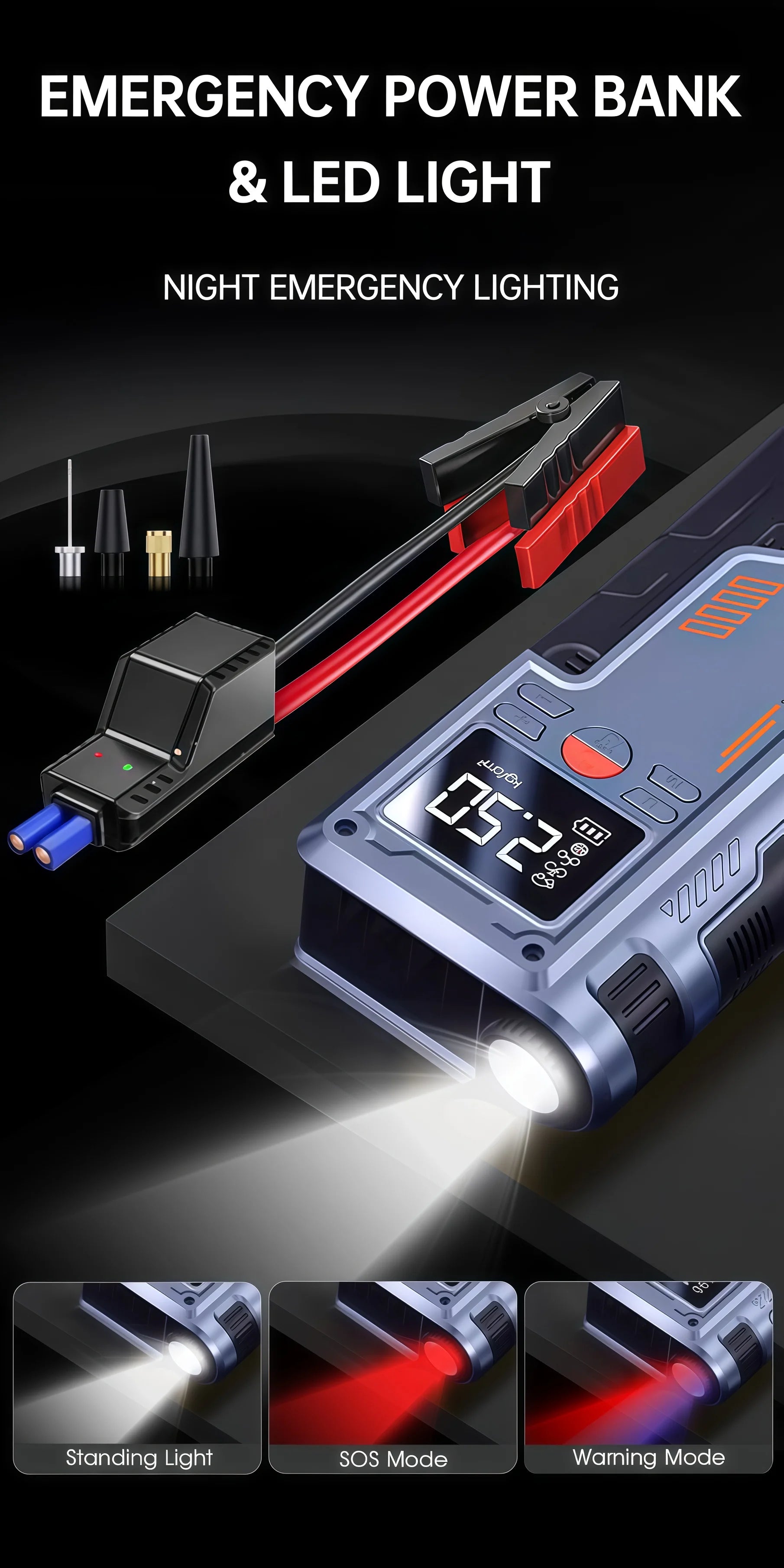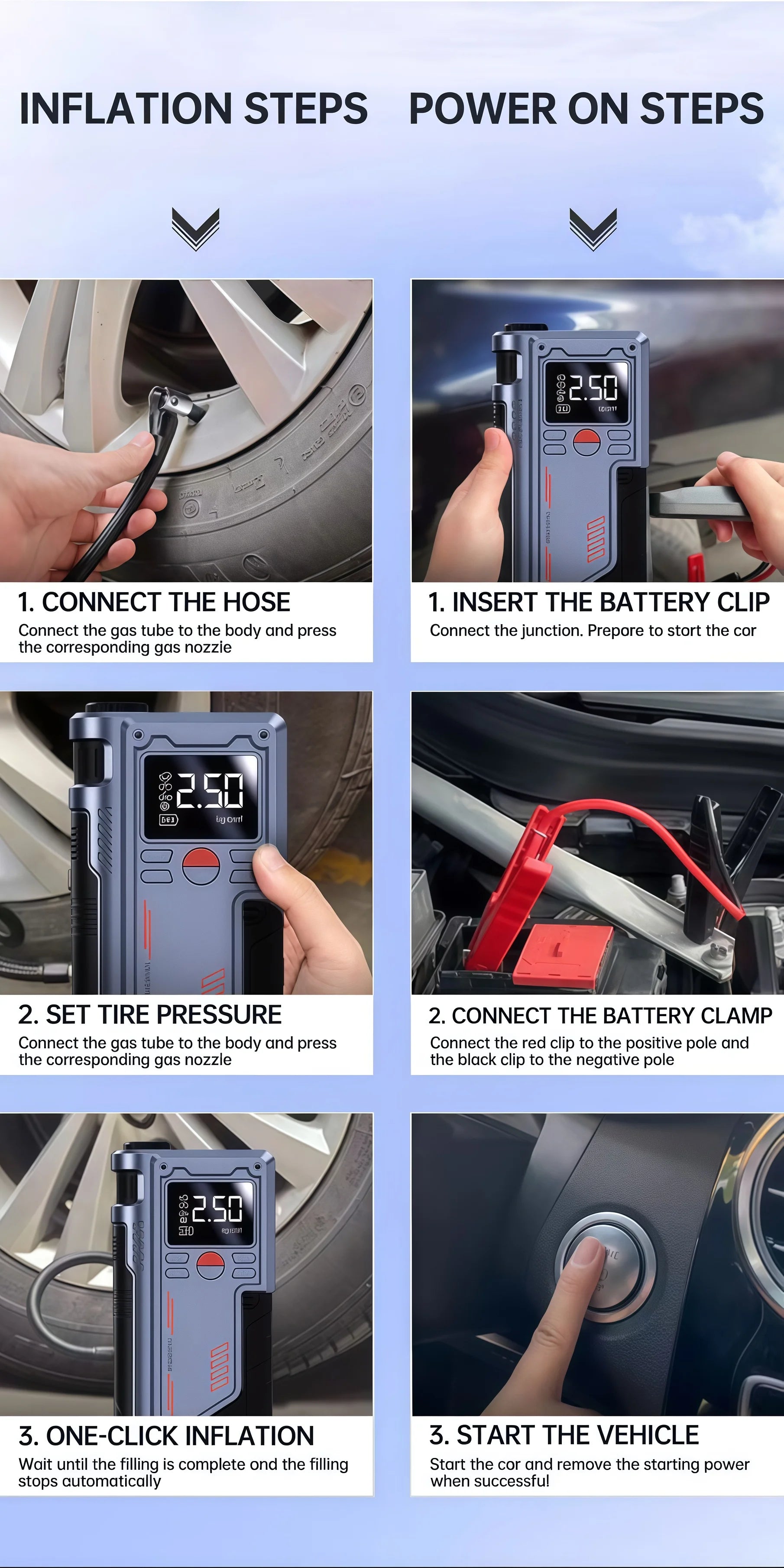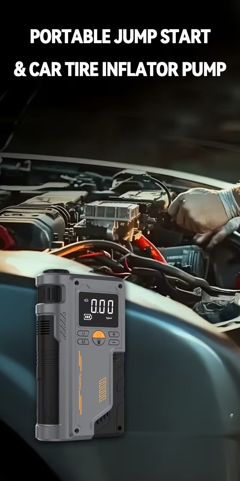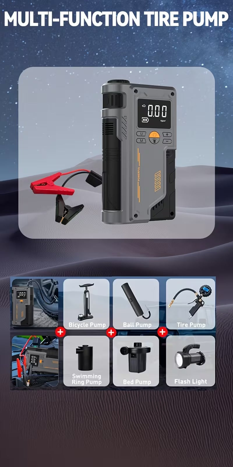 ✅ 4-in-1 Functionality: Car jump starter, tire inflator, power bank, and LED flashlight.