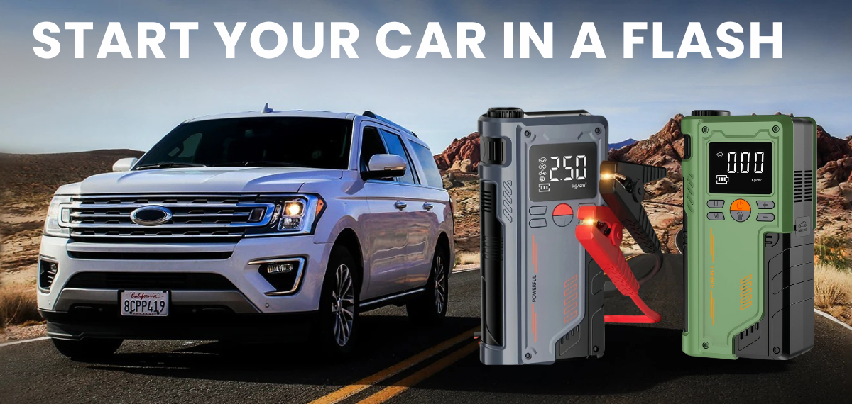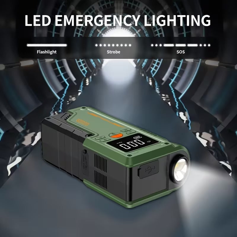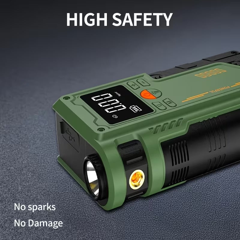 Equipped with a 2600A peak current, this portable power station can quickly jump-start cars, SUVs, motorcycles, and trucks. The built-in air compressor inflator easily pumps up tires, sports gear, and more, while the multi-function power bank charges your devices on the go.