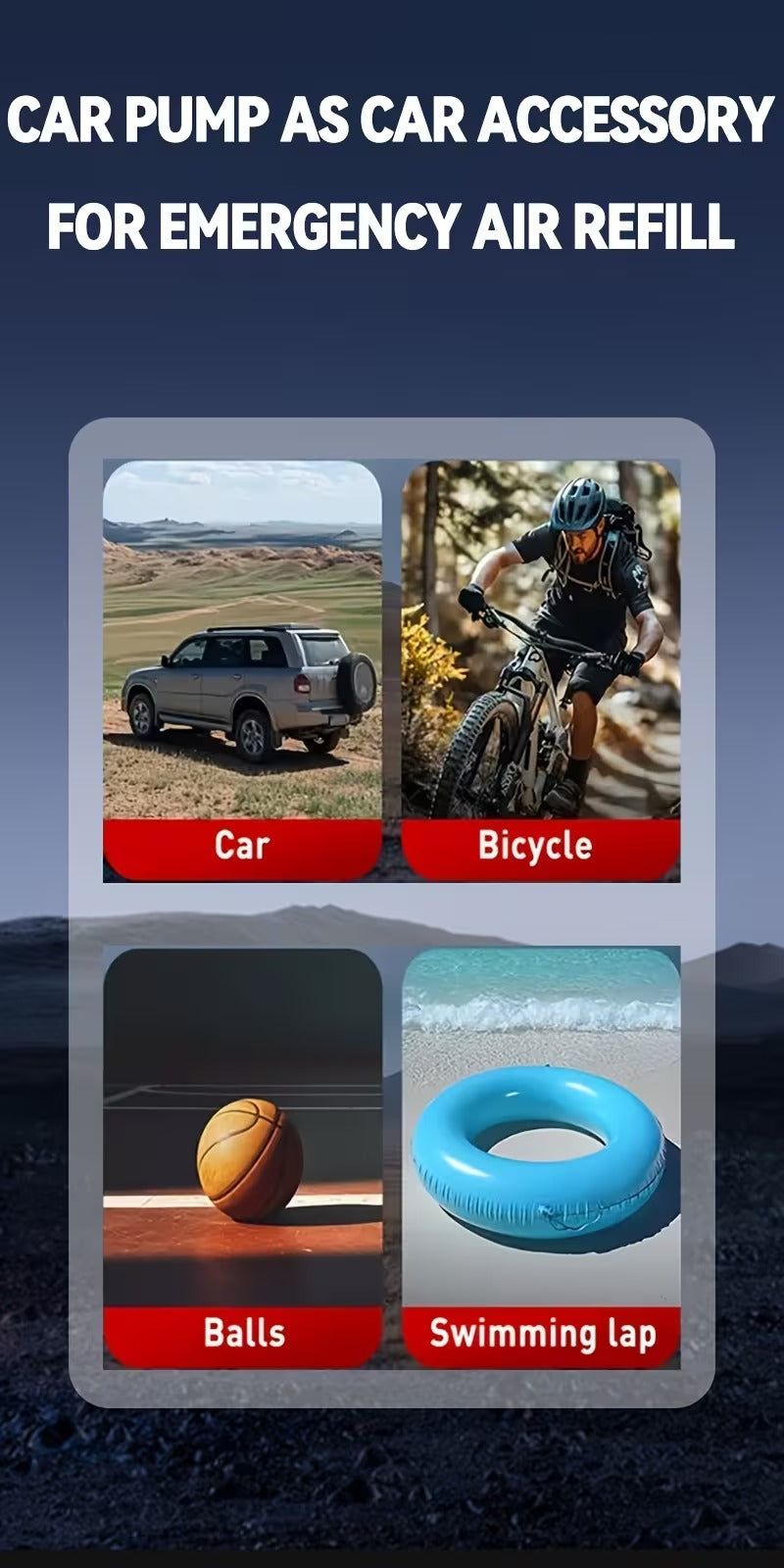 ✅ Air Compressor Pump: Quickly inflates tires, balls, and other inflatables.
